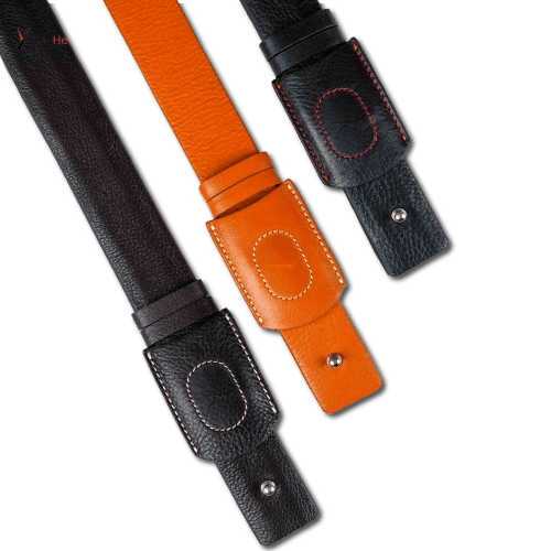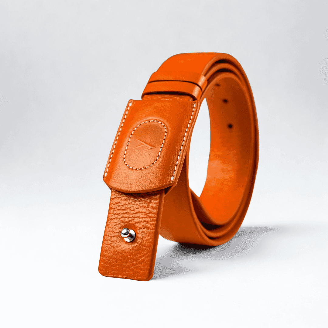 The Titan Minimalist Belt redefines classic waistwear with its innovative stud-fastening design. Crafted from high-quality pebble-grain leather, this belt eliminates the bulk of traditional buckles, offering a sleek, flush look that complements both formal trousers and casual denim. The double-stitched edges ensure maximum durability, maintaining its shape and rich texture over years of wear. It is the perfect choice for someone looking for subtle sophistication and a streamlined silhouette. Key Features: - Minimalist Design: No bulky buckle, providing a seamless and comfortable fit. - Innovative Fastening: Uses a secure stud-lock mechanism for a modern look. - High Durability: Reinforced contrast stitching for long-lasting use. - Versatile Style: Transition easily from corporate office wear to smart-casual events. Color Variants: 1. Classic Black: A timeless, deep black for formal elegance. 2. Burnt Orange: A bold, trendy shade for a standout fashion statement.